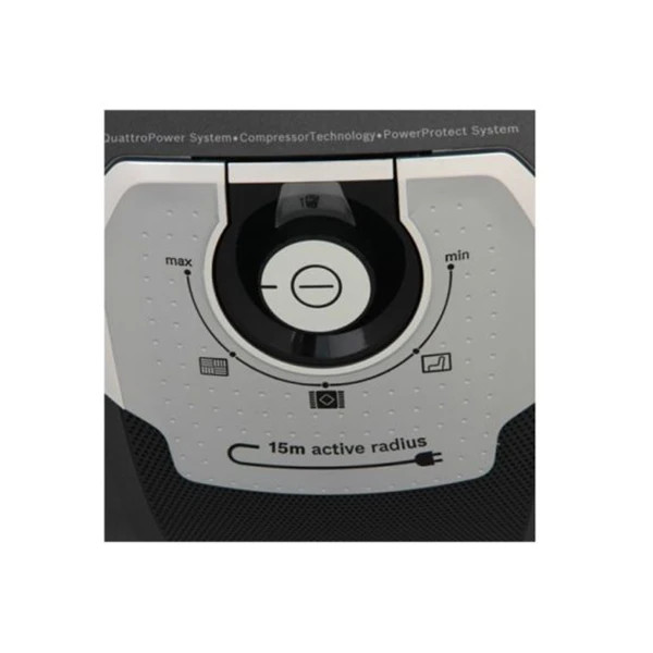 - بر قسمت بالایی بدنه دکمه و ولوم پرخشی قرار دارد که دورش را نواری کرومی در بر میگیرد. با این ولوم قدرت مکش و دور موتور قابل تنظیم است.