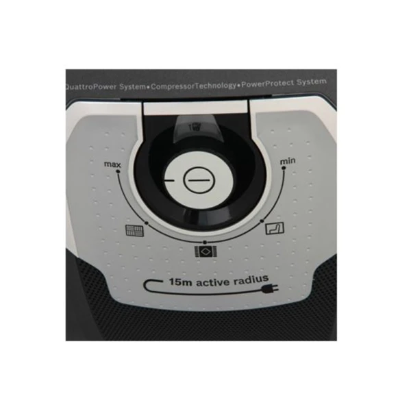 - بر قسمت بالایی بدنه دکمه و ولوم پرخشی قرار دارد که دورش را نواری کرومی در بر میگیرد. با این ولوم قدرت مکش و دور موتور قابل تنظیم است.